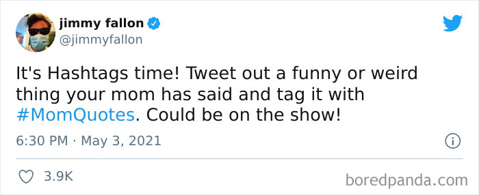 And just in time for Mom’s day, Jimmy Fallon put up an announcement: “Tweet out a funny or weird thing your mom has said and tag it with #MomQuotes,” on May 3.