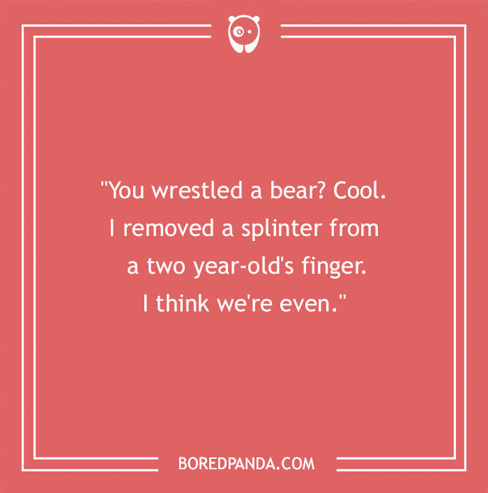 "You wrestled a bear? Cool. I removed a splinter from a two year-old's finger. I think we're even."