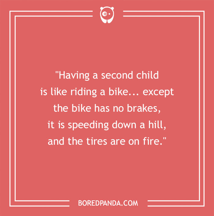 "Having a second child is like riding a bike... except the bike has no brakes, it is speeding down a hill, and the tires are on fire."