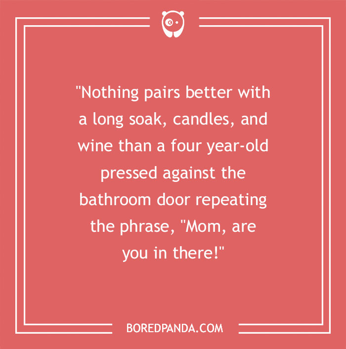 "Nothing pairs better with a long soak, candles, and wine than a four year-old pressed against the bathroom door repeating the phrase, "Mom, are you in there!"