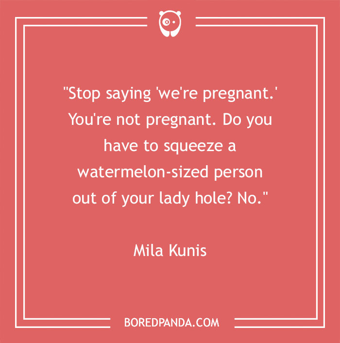 "Stop saying 'we're pregnant.' You're not pregnant. Do you have to squeeze a watermelon-sized person out of your lady hole? No." - Mila Kunis