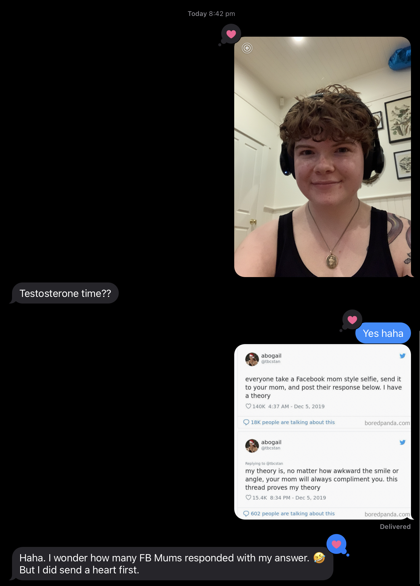 She started a Twitter thread where she invited people to take “Facebook mom style” selfies, send them to their moms, and then post their responses. As you could have probably expected, a lot of people took Abigail up on her suggestion, the thread went viral, and the replies were wholesome and heart-warming. Except for a few surprising responses that made us chuckle.