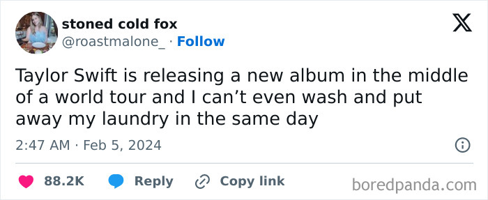 I bet Taylor Swift would struggle to put her laundry away the same day too, if she didn't have people for that.