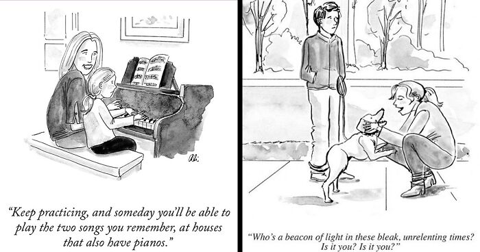 Reflecting on her evolution from The Cornell Daily Sun to The New Yorker, the artist said to Bored Panda, "While drawing for the Daily Sun, I was working within the confines of a comic strip, so I had multiple panels over multiple days to tell a longer story that could build over time. With New Yorker cartoons, they're all single-panel gags, so I've had to learn to convey a lot within a smaller framework.
