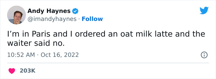 Stand-up comedian Andy’s thread got a jaw-dropping amount of attention online. He got over 203k likes. But the true beauty of his tweet about asking for an oat milk coffee in Paris was how much he inspired other travelers to open up about their own gastronomic and other experiences while abroad.