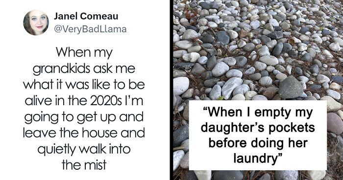 A humorous parent tweet showing a pile of rocks representing items found in a daughter's pockets before laundry.