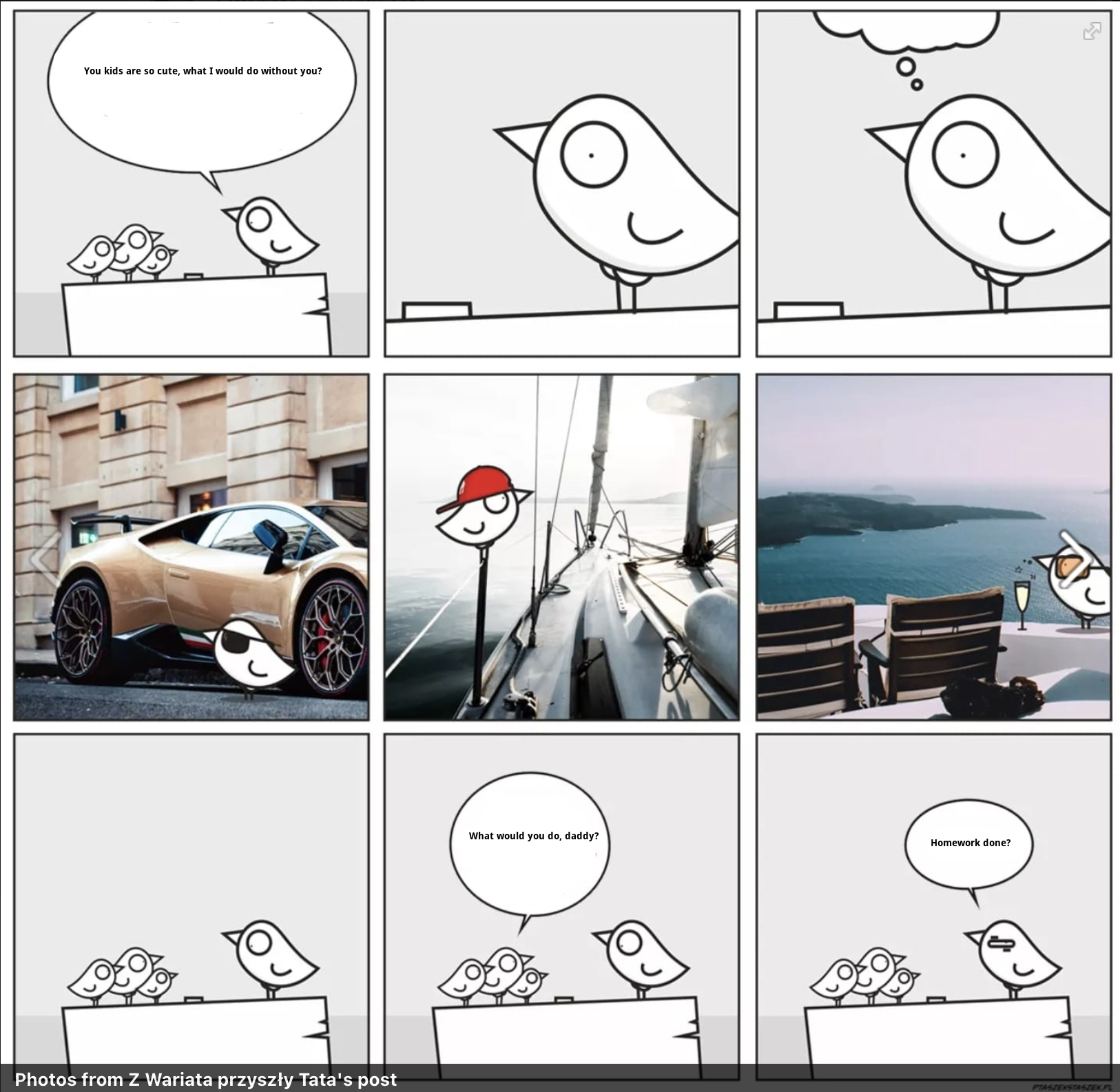 Look at this: https://www.facebook.com/504145886659578/posts/jakie-to-prawdziwe-ptaszek-staszek/848879938852836/ Translation: Frame 1. "You kids are so cute, what I would do without you?!" Frame 8. "What would you do, daddy?" Frame 9. "Bollocks." - hard to translate, literally means "egg", figuratively "f**k off"
