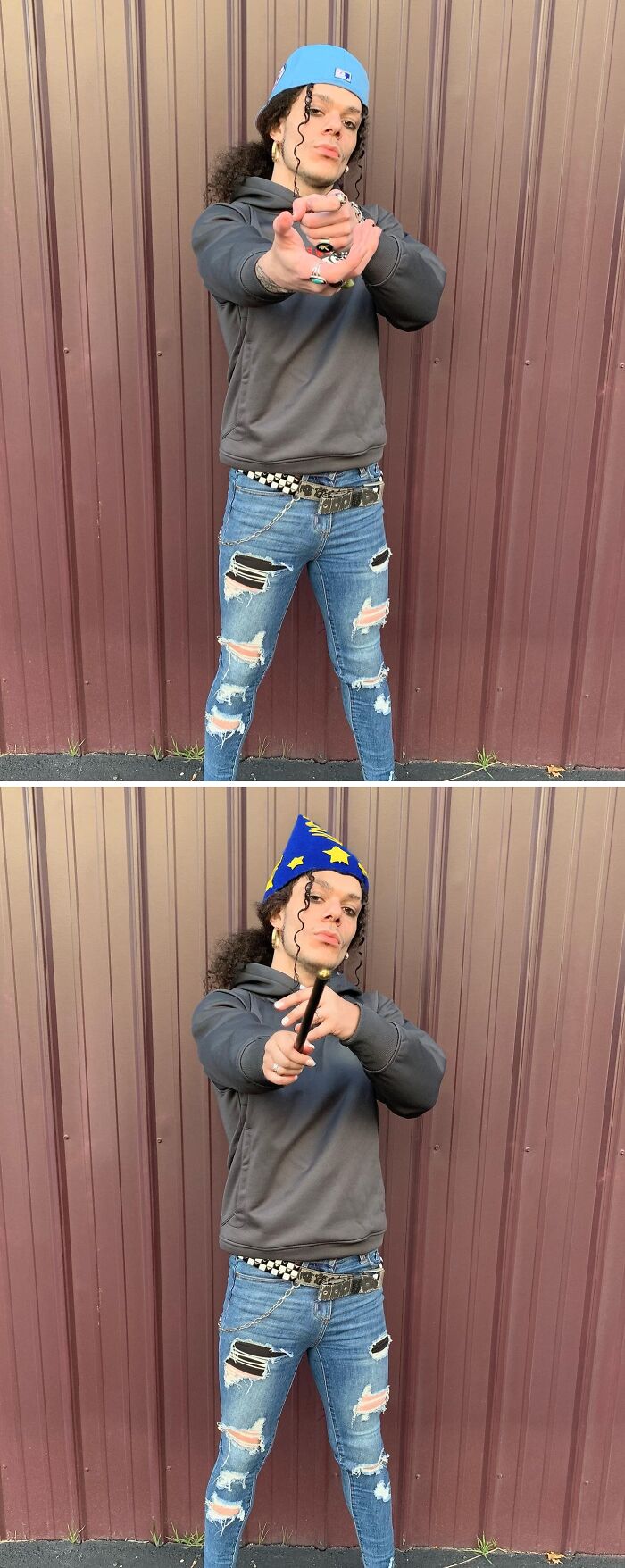 Person playfully posing in edited photo with a wizard hat and wand.