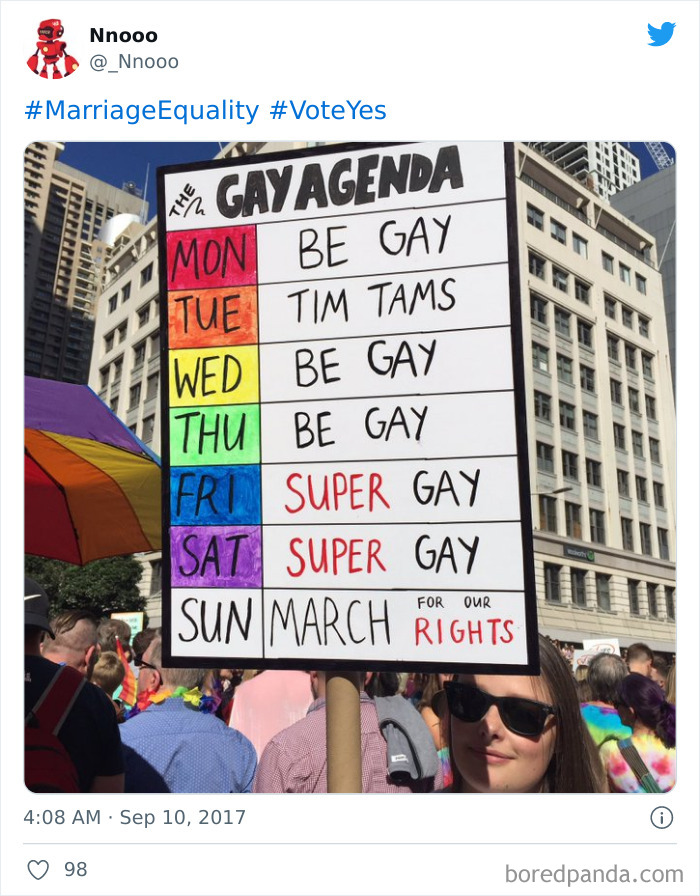 What’s not addressed enough about the LGBTQ+ community is how hysterically funny its people are. Just take a closer look at the funny pride signs and posters of Pride parade participants. Below, we selected some of the wittiest ones for you to chuckle at and spread that feel-good vibe to you!