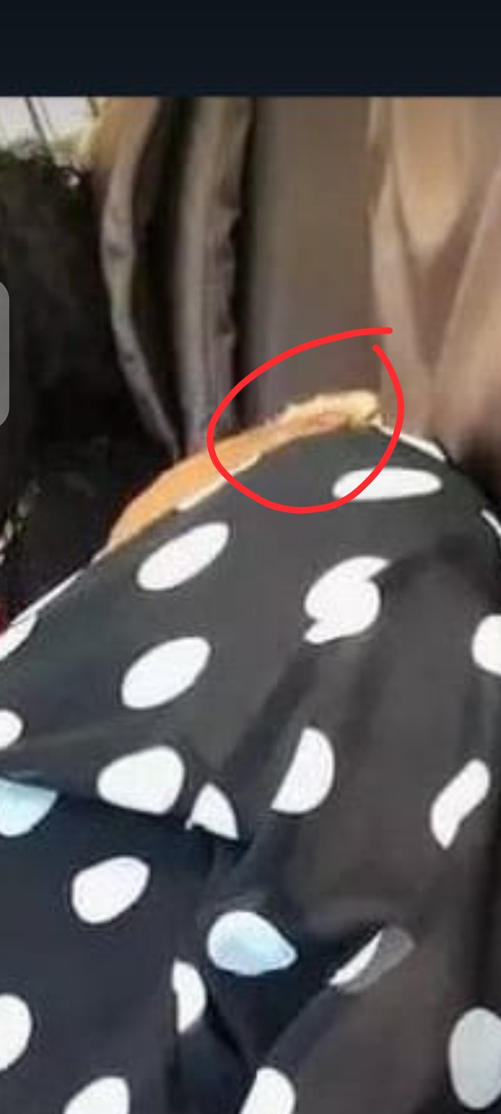 Okay, after spending entirely too much time wandering the internets, I found the answer. Her head is leaned all the way over to the right side, you can see a tiny bit of her grey hair and face. FUMmyXEXsA...aa84a0.jpg