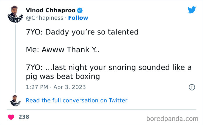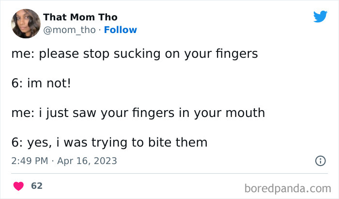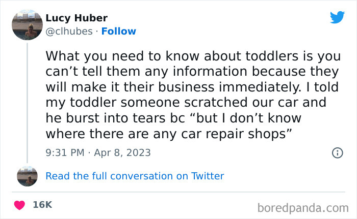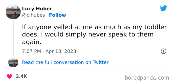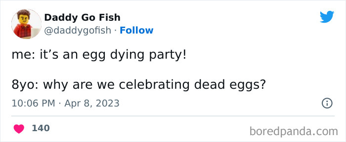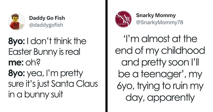 Load More Replies...We were on holiday in Spain recently so here are some from my son. He calls palm trees holiday trees which is sweet. He only ever sees them when we are abroad. In the hotel he went up to a man who was clearly over 70 years old and said hello. The man said hello to my son. My son the asks “How old are you? Are you 36 years old?” The man laughs and says that he is 36. My son: “I’m 8 and we need to go to the lift”. Another time we were in the lift and there was another family in there as well with a buggy. The lift stops at another floor and as the door opens so more people get on, he says “ Uh-uh, I’m sorry we are too busy in this lift”. The people waited for the next lift. And finally one day at breakfast he starts singing “nippleboobs” quite loudly and then proudly asks us if he sang the nippleboob song.