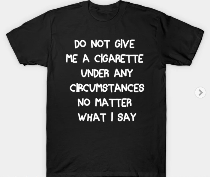 Our version here if you like it @https://www.teepublic.com/t-shirt/39665551-do-not-give-me-a-cigarette-under-any-circumstances Capture-dc...9f-png.jpg