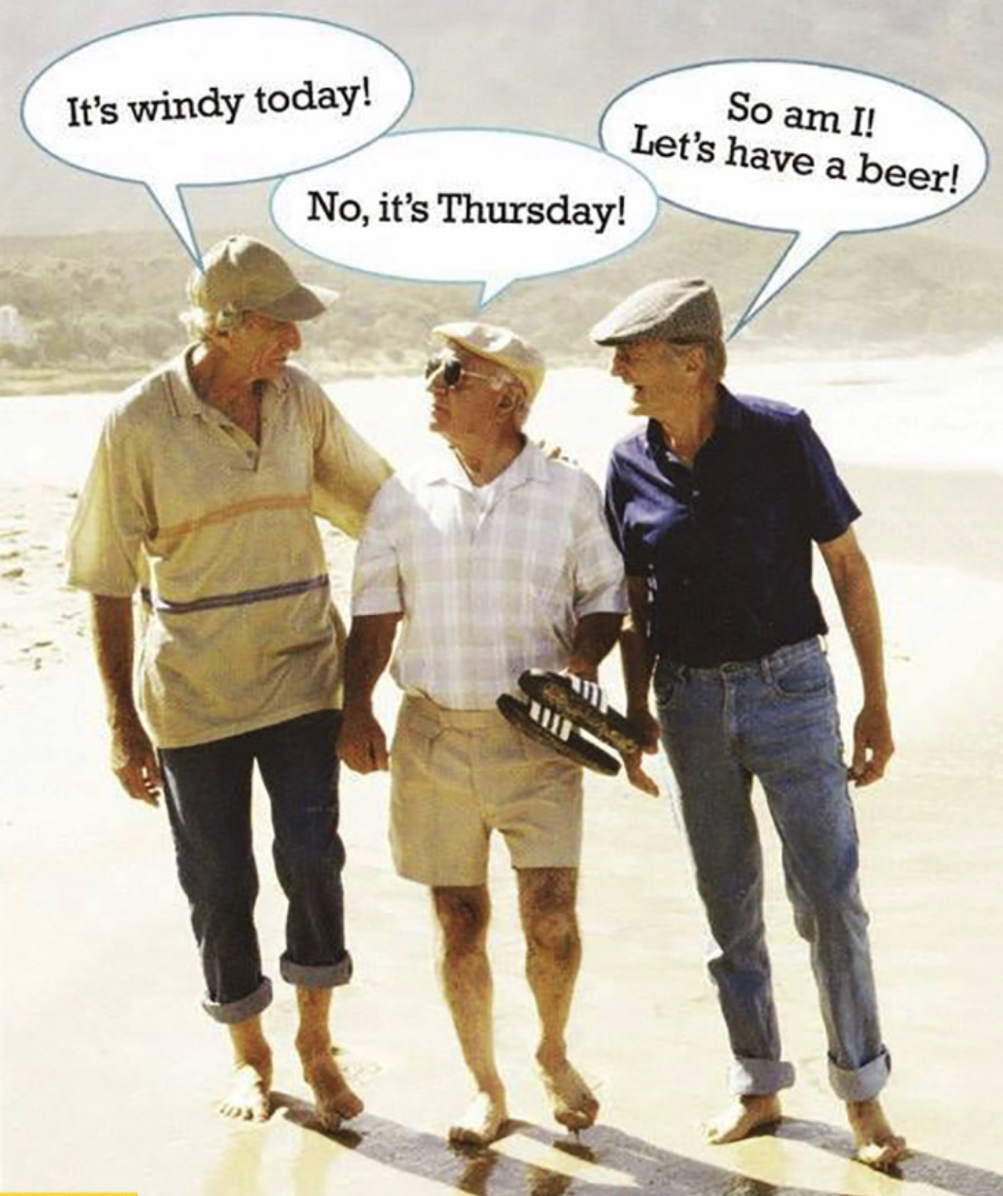 Translation- Guy 1 “It’s windy today!” What Guy 2 heard: “It’s Wednesday today”. Guy 2 says “No, It’s Thursday!” What Guy 3 heard “No, I’m thirsty!” Sorry I just had to do it.