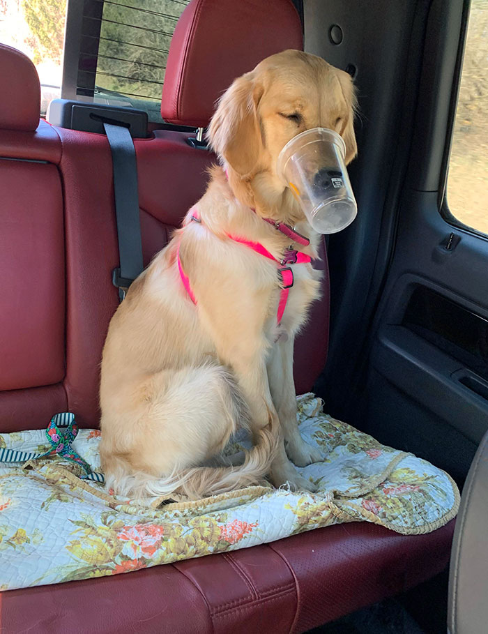 Poor Girl Got Her Face Stuck In A Milkshake Cup. She's Such A Mellow Dog That She Didn't Even Try To Remove It Herself. Just Looked At Us For Help