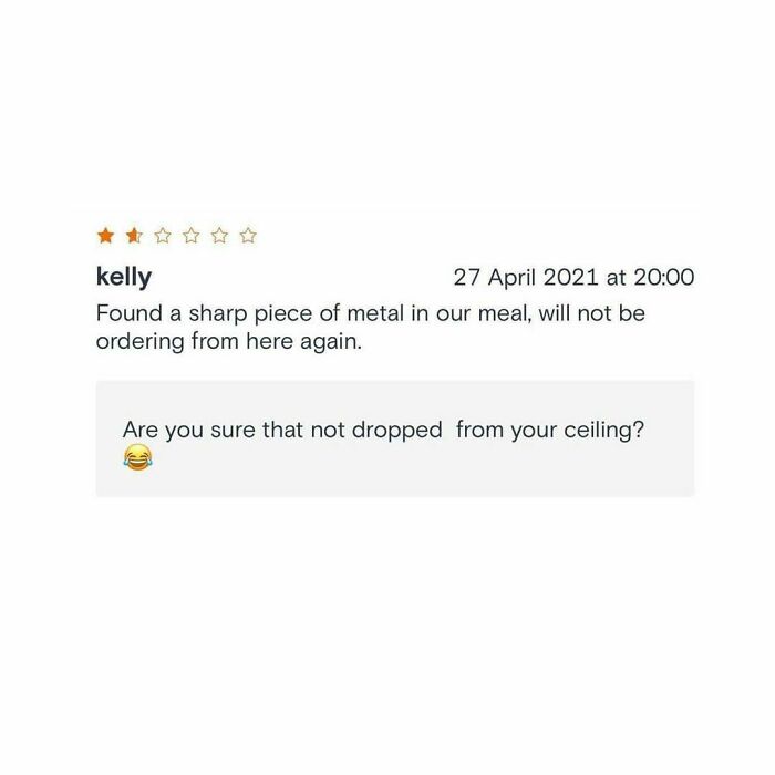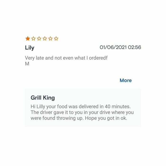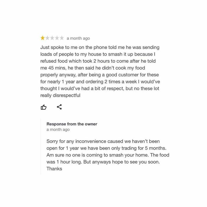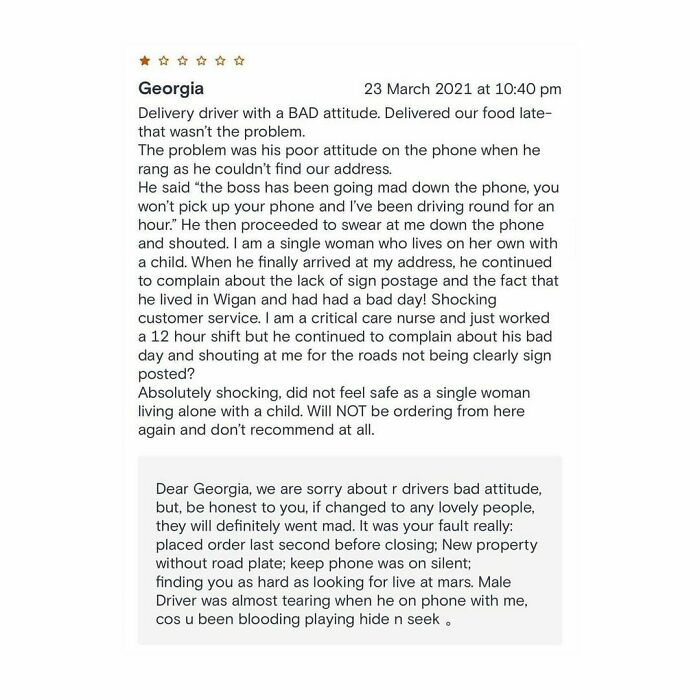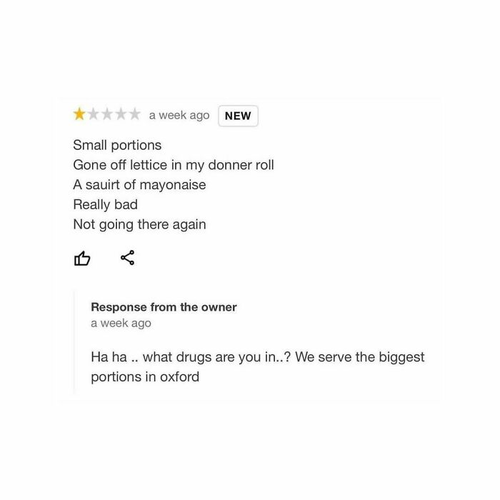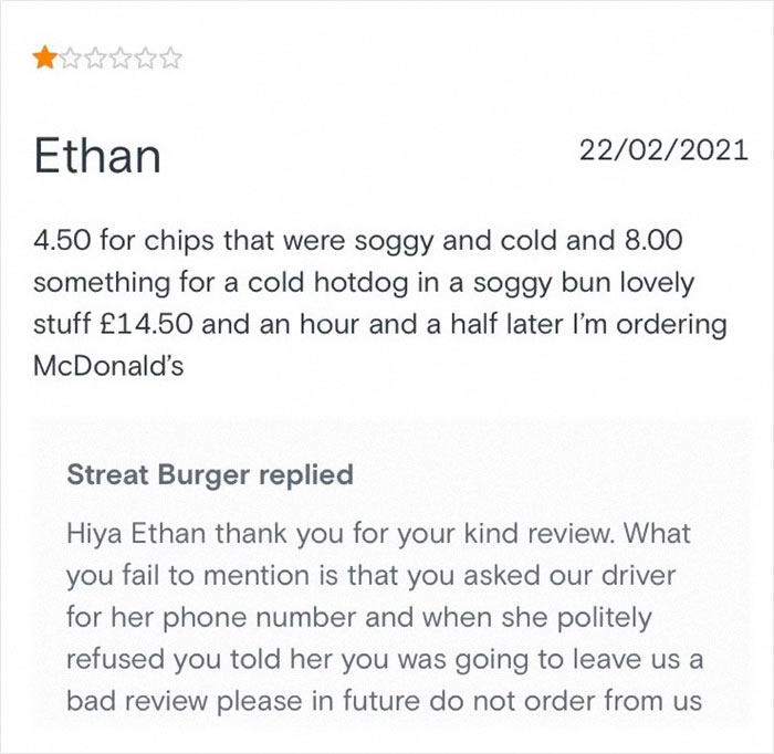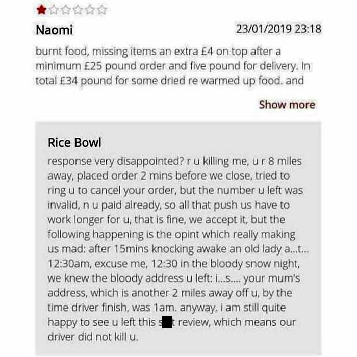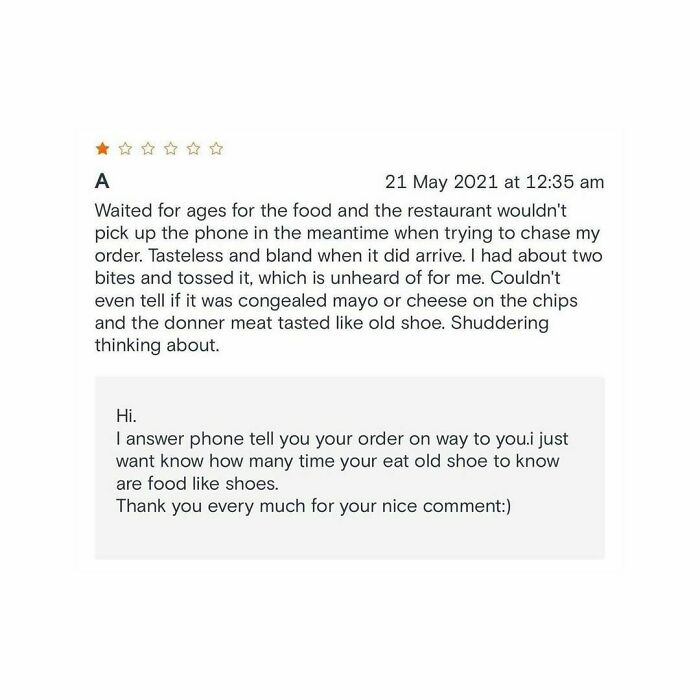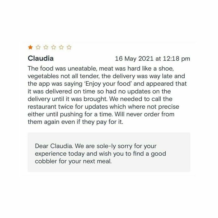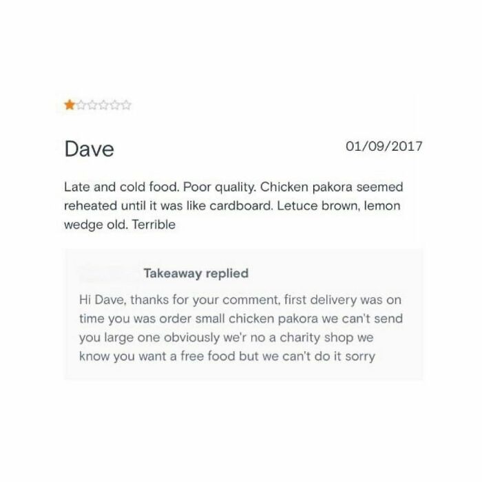 So thanks to the Instagram page “Takeaway Trauma” that’s dedicated entirely to such cases, below waits a solid collection of bad reviews and the badass responses to them. Upvote your faves and be sure to check out part 1 of this post!
