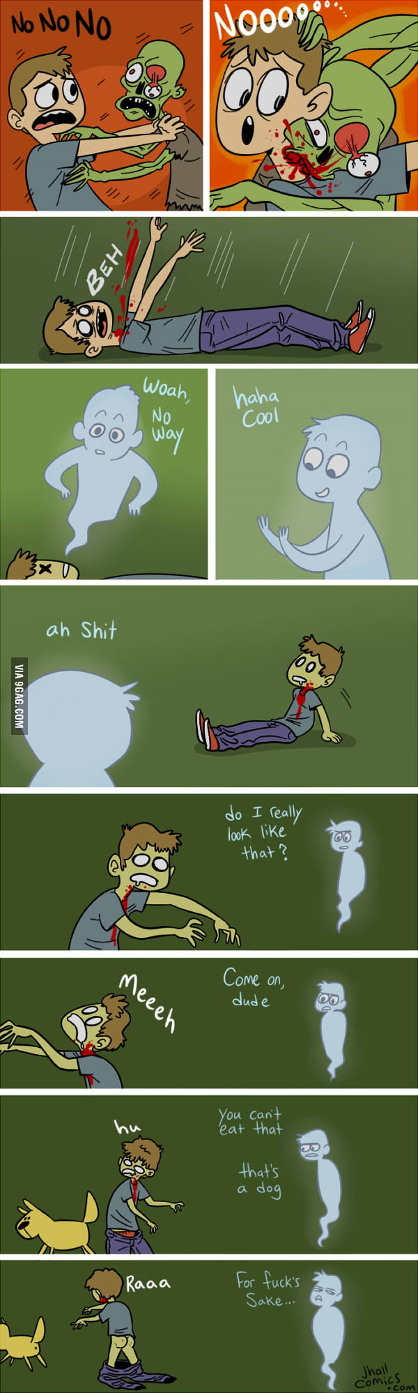 My favourite Tumblr with prompt was one that had a zombie and a ghost come from the same dead body, so that the ghost is just watching the zombie just wandering into ditches and stuff. I think someone did a comic version too