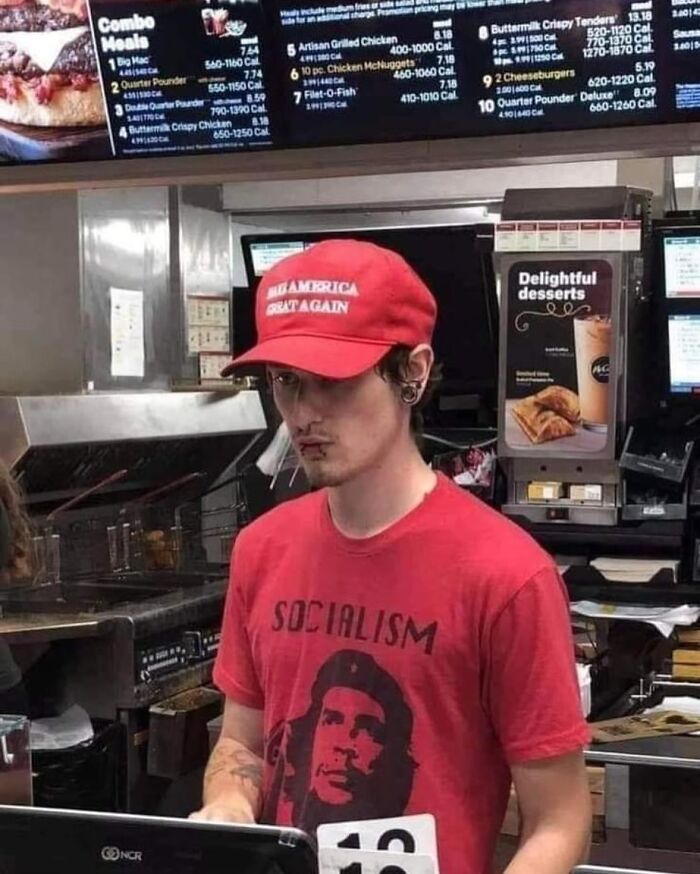 convinced this is a photo shop...mcdonald's would never let him work in a shirt or hat that was not part of its official uniform....plus, the hat is way too big