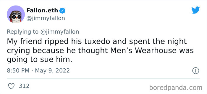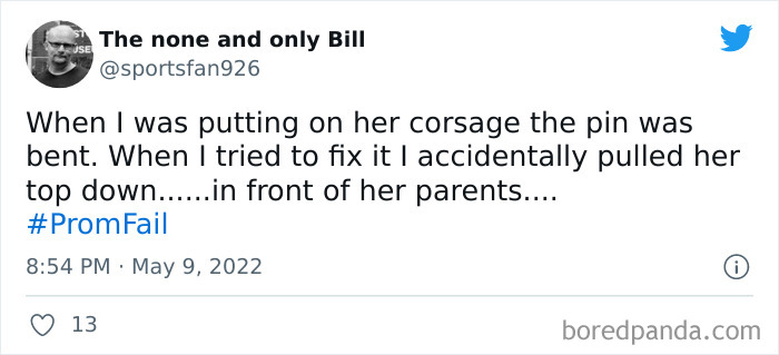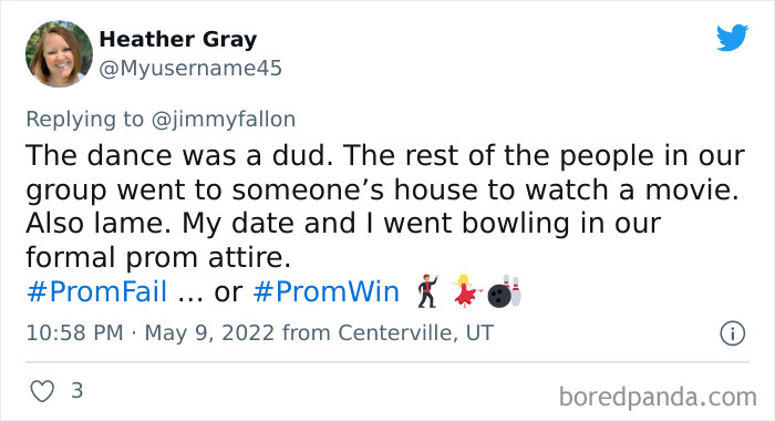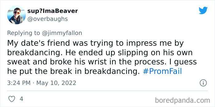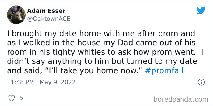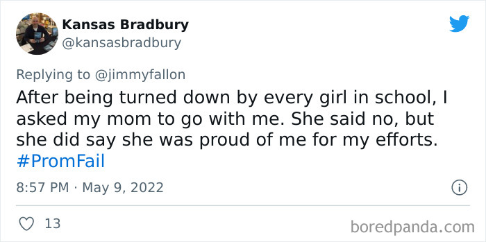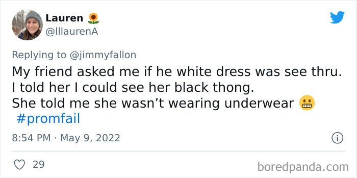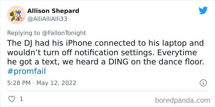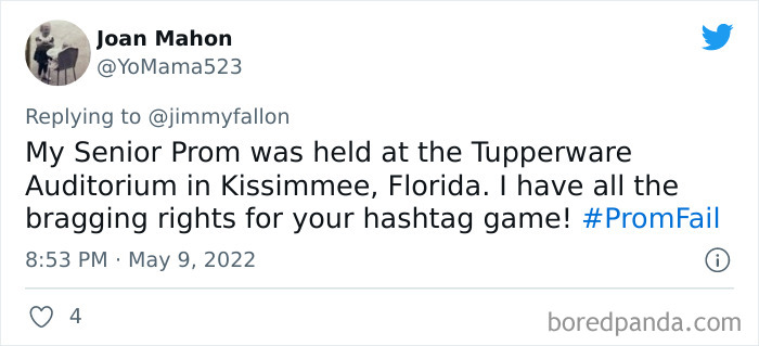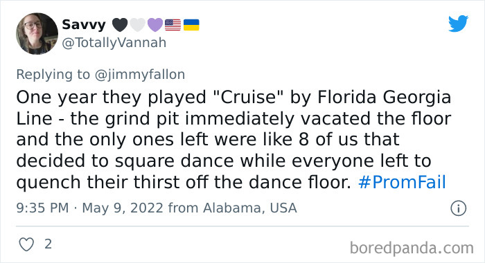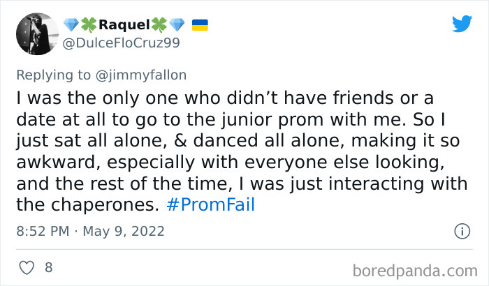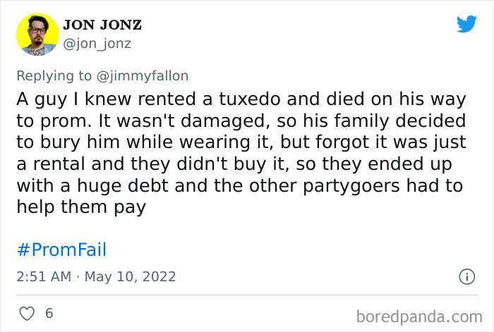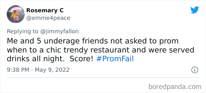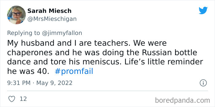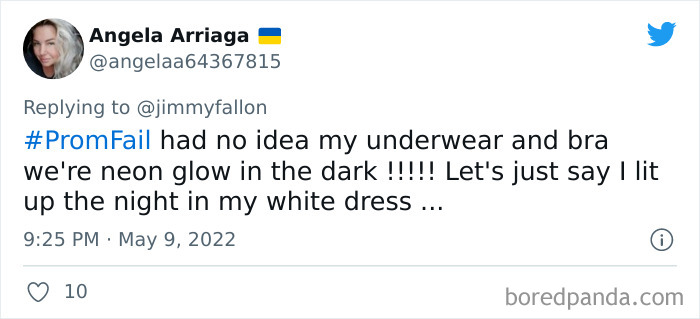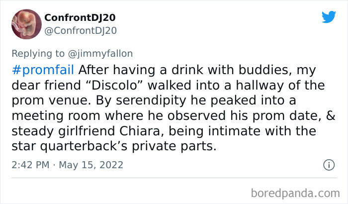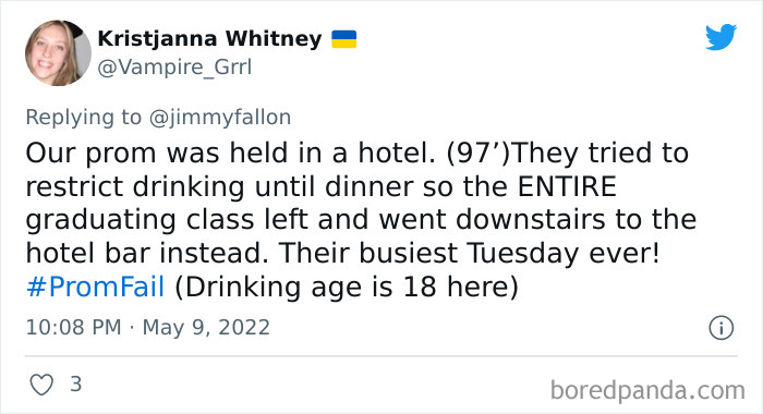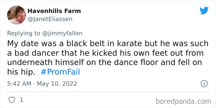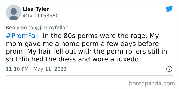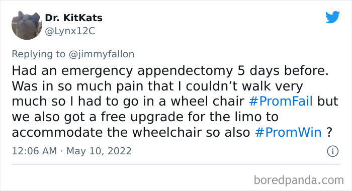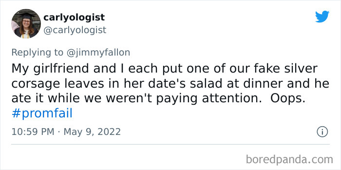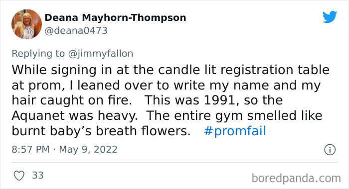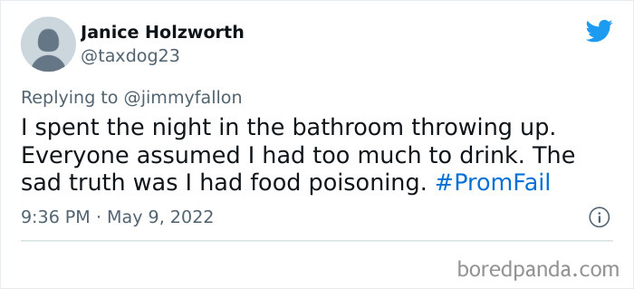 From hilarious wardrobe mishaps to hair catching on fire, we at Bored Panda have selected some of the best tweets from this thread. So buckle up, scroll down, and share how ridiculous your prom experience was in the comment section below! And after you’re done reading this post, be sure to check out some funny responses to Fallon’s recent challenges on #NanaQuotes, #MyHighSchoolWasWeird, and #WorstGiftEver.