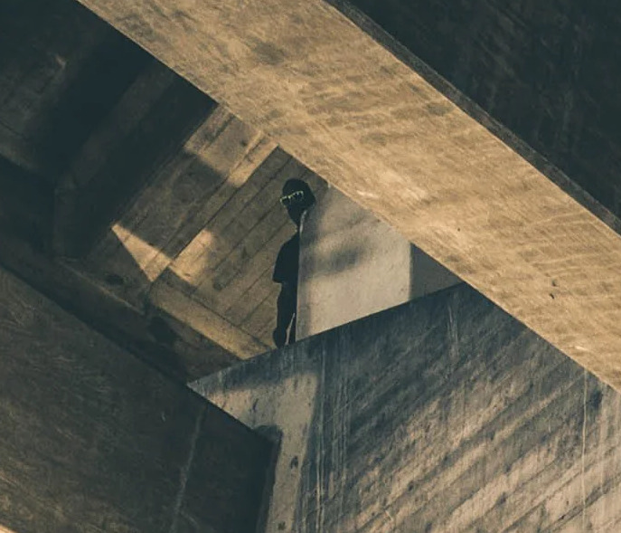 Above the gap between the top first and second beams from the right is a guy wearing glasses.