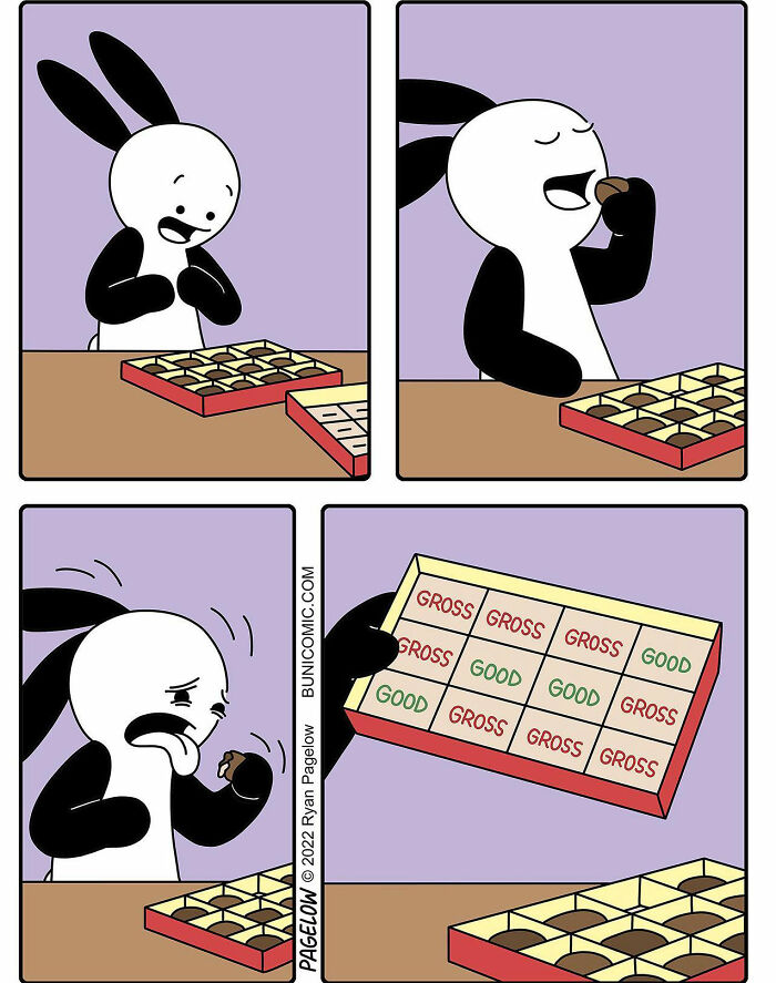 Interview With Artist"An idea for a visually cute – yet dark and twisted – webcomic had been rolling around in my head for a few years. What emerged was an optimistic and cute bunny, named Buni, with terrible luck," Ryan Pagelow first introduced his comics on Bored Panda back in 2018. Fast forward 4 years later and the artist now has around 714k followers on Instagram!