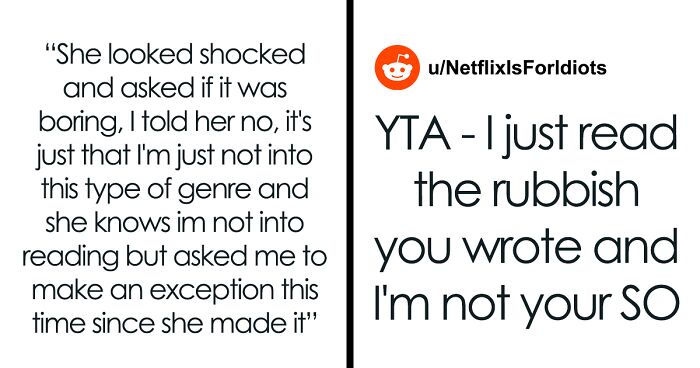 Folks online voted that the guy is the jerk in this situation. “All I read was I’m a [terrible] bf and can’t do something as simple as sitting and reading to make my gf happy,” one user wrote and received much support. “This is so important in a relationship. My other is not artistic at all but he acts interested,” another added.