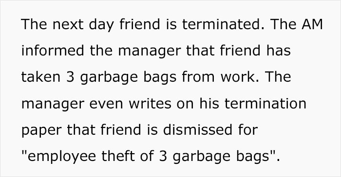 An internaut shared a story of how his friend got fired for taking 3 trash bags from work