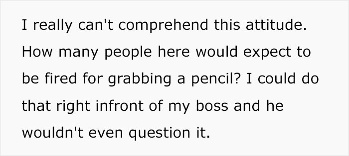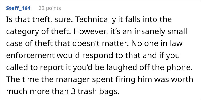 You can read more comments by checking out the Reddit post, but before you go, tell us your thoughts on this. Was he wrong to steal, was the manager wrong to jump to such a conclusion without confronting the employee? Was everyone wrong, or nobody? Discuss and debate in the comment section below!