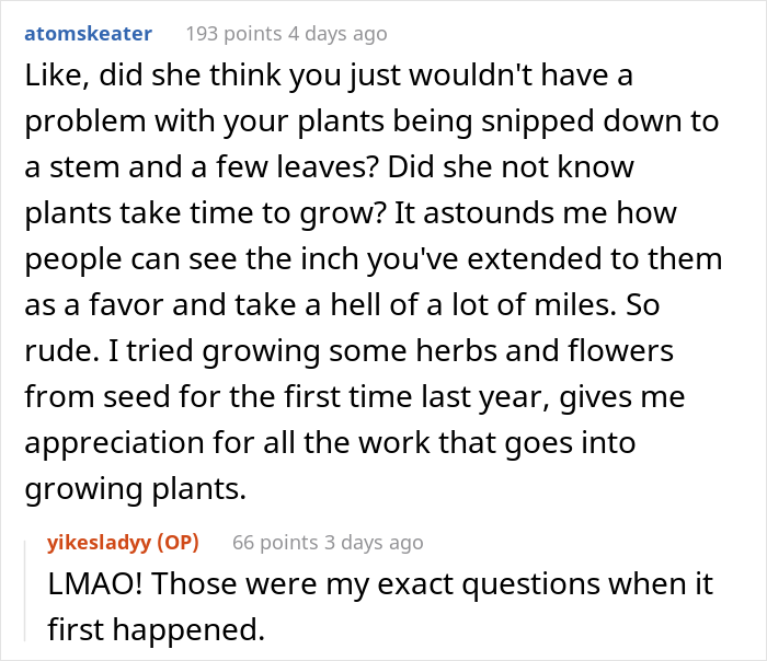 We were wondering if this is really entitled at this point, or is it just sheer misunderstanding on the girlfriend’s part, and she simply didn’t know how to deal with it afterwards? And OP said they’re not entirely sure. But “most people realize that plants need time to grow and that it’s rude to take a mile when you’ve been offered an inch.”