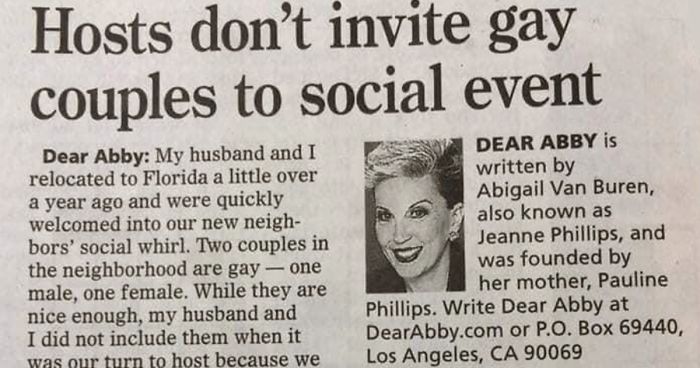 “Dear Abby, My husband and I relocated to Florida a little over a year ago and were quickly welcomed into our new neighbors’ social whirl,” they wrote. “Two couples in the neighborhood are gay — one male, one female. While they are nice enough, my husband and I did not include them when it was our turn to host because we do not approve of their lifestyle choices. Since then, we have been excluded from neighborhood gatherings, and someone even suggested that we are bigots!”