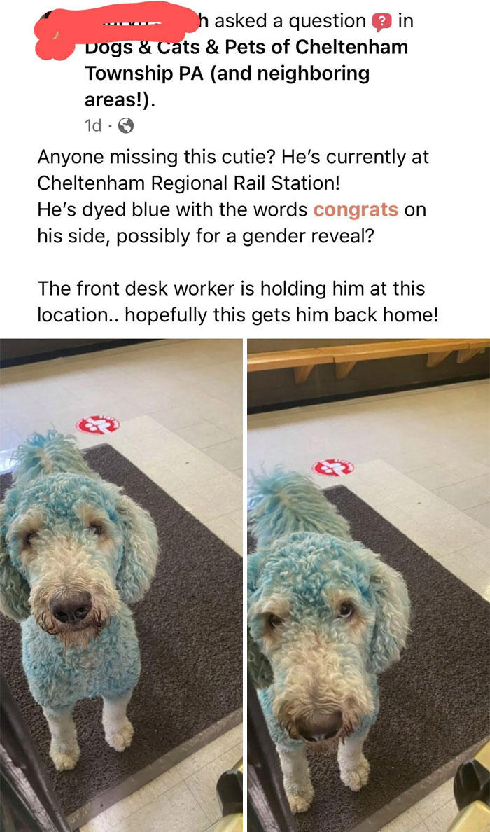 Someone Dyed Their Dog Blue For A Gender Reveal And It Ran Away