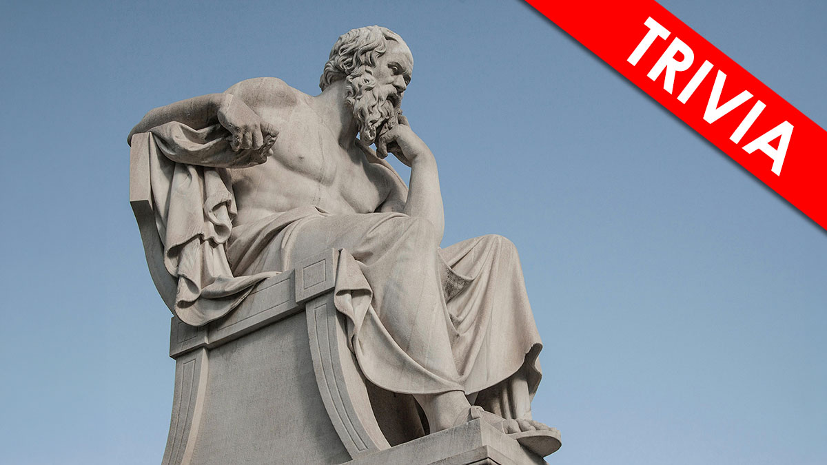 Marble statue of a philosopher deep in thought under clear sky with red trivia banner, representing general knowledge questions.