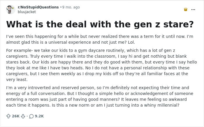 Honestly, this is the first I've heard of of the "Gen Z stare but I think I do it too, upon retrospect.
