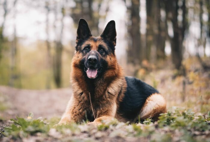 German Shepherd lying down on a forest path, showcasing its distinctive coat and alert expression.