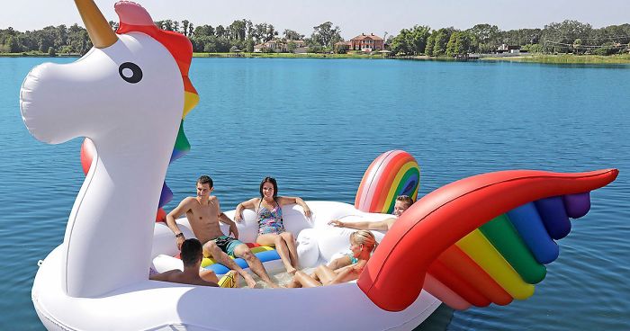 We’ve seen some bizarre inflatable creations in the past, as well as genius inventions that make lives easier, but why limit yourself to regular floating devices when there’s an enormous rainbow unicorn inflatable island available for purchase?
