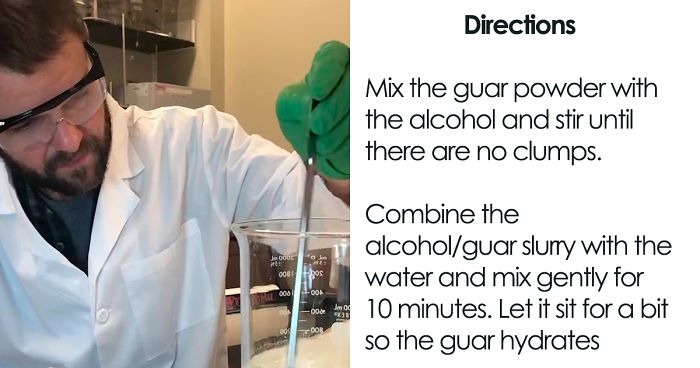Combine the alcohol/guar slurry with the water and mix gently for 10 minutes. Let it sit for a bit so the guar hydrates. Then mix again. The water should thicken slightly, like thin soup or unset gelatin.