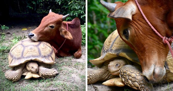 Giant Tortoise And Baby Cow Who Lost Its Leg Become Best Friends, Do Everything Together