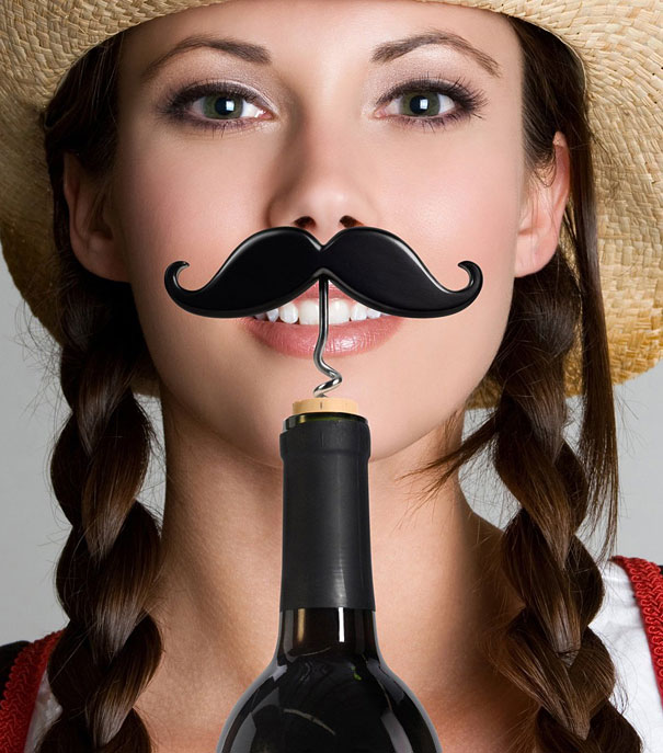 Fred & Friends Handlebar is a moustache designed corkscrew and bottle opener. The handle is a high gloss, well crafted aluminum with a stainless steel cork screw. (buy)