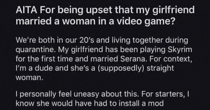 It turns out the man in his 20s has become seriously suspicious of his “supposedly straight girlfriend” after she married a female character in a video game. “My girlfriend has been playing Skyrim for the first time and married Serana,” he said and made it clear how upset the whole thing made him.