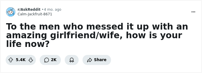 Well, when Reddit user Calm-Jackfruit-8671 asked, “To the men who messed it up with an amazing girlfriend/wife, how is your life now?”, male netizens shared whether life turned for the better or worse. If you have messed up similarly, you might also be able to relate to these stories, so just scroll down to read them!