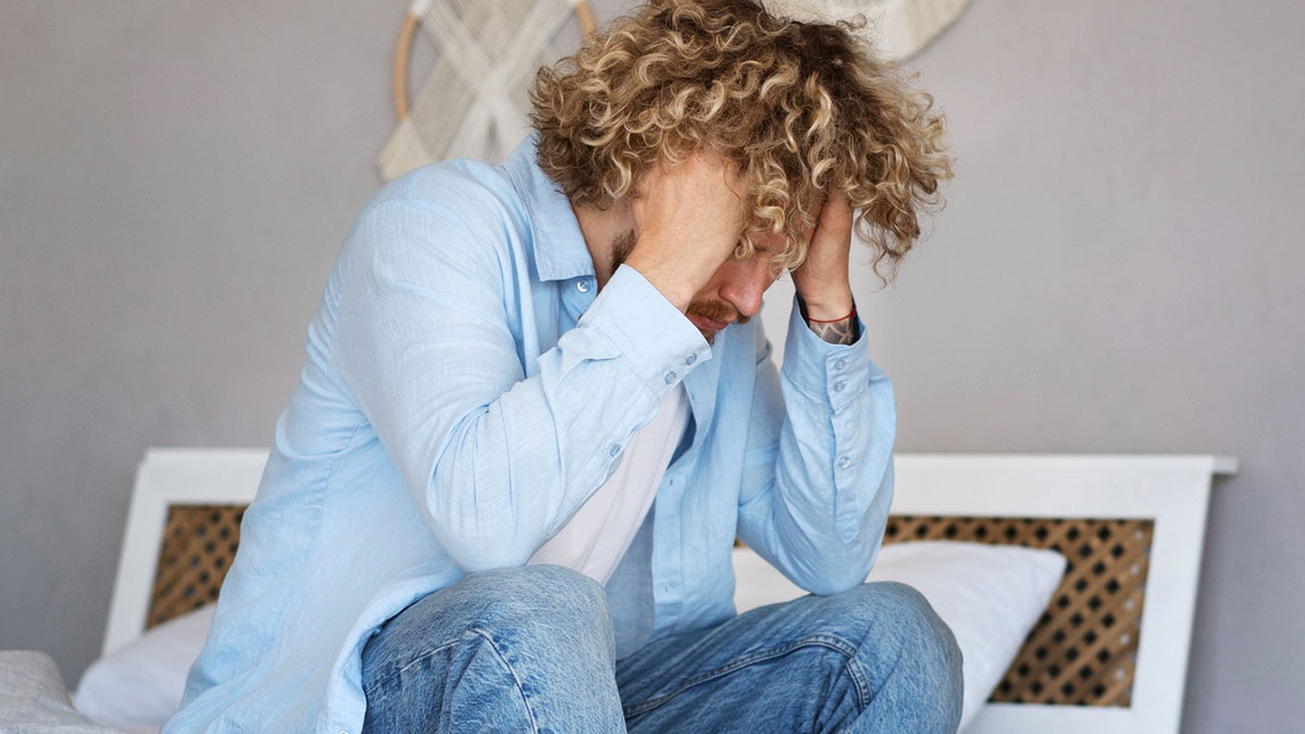 Man sitting on bed with head in hands, looking stressed and upset after back-to-back cheating girlfriends experience.