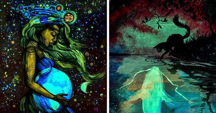 Usually I work with oil, watercolor, but I like to getting know new materials. It is always challenging if people start new things. This was the very first time, when I painted with “glow-in-the-dark colors”, and I loved every single minutes! It seemed like an exciting journey to another world, it was like some kind of magic to me.