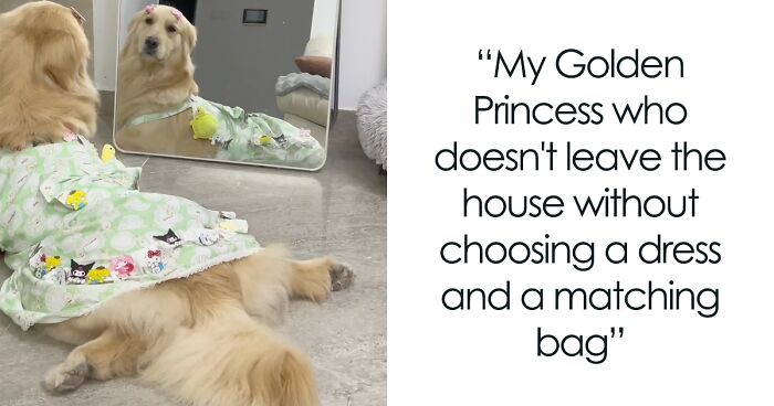 There are also several videos on social media of a golden retriever named ‘Sakura-chan’ from Jiangxi province, China, where we can see the dog enthusiastically running back and forth from the mirror while dressing up in adorable different style dresses and carrying matching handbags.