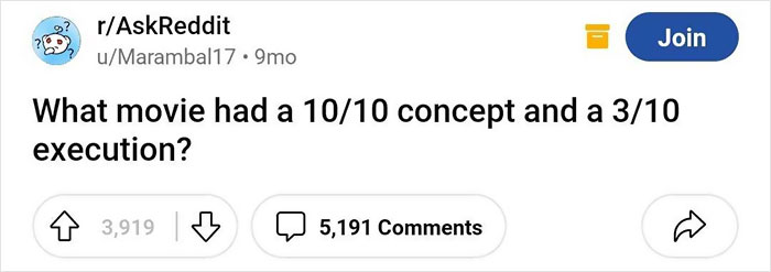 So when one netizen asked fellow movie lovers, "What movie had a 10/10 concept and a 3/10 execution?", lots of people had their one poorly-executed movie pick. Whether it was a lacking storyline, not enough chemistry between the actors, or something less tangible that's even hard to put into words, people didn't hesitate to share them.