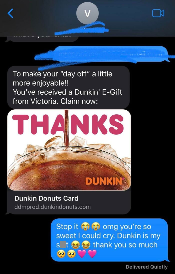 I’ve been helping this girl out by doing chores at her apartment, caring for her pets, organizing, etc. since she is too busy because she is about to take her bar exam. I’m OBSESSED with dunkin refreshers, and I’ve shown up with one almost every week. I go over there this morning, and she sent me this literally could cry. She was paying attention, I see. It’s the little things. It really is.