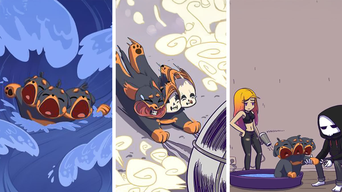 Comic of goofy gods dealing with daily life: a three-headed dog faces storms, chainsaws, and grooming by a girl and hooded figure.