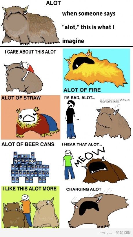 “A lot” is two words. Principle/Principal as in “Mr. Smith is the school principle.” Aaarrrgghh!!