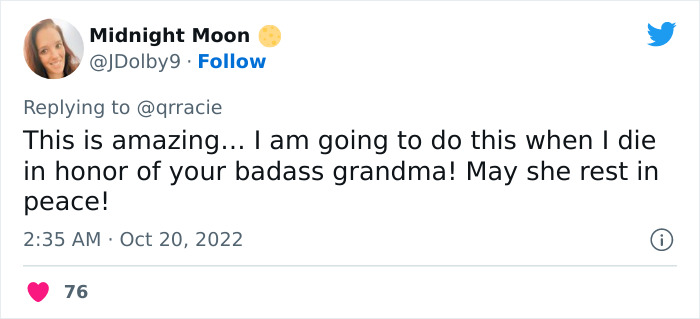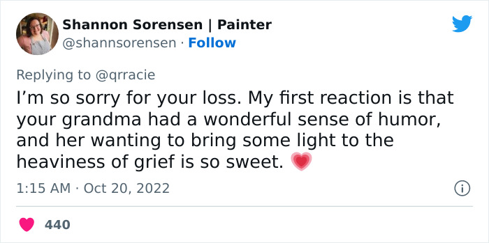 “I am so sorry for your loss. However, this is the stuff of LEGENDS! And now, you have it to look at whenever you feel down,” said another. One other person commented: “I’m so sorry for your loss. My first reaction is that your grandma had a wonderful sense of humor, and her wanting to bring some light to the heaviness of grief is so sweet.”