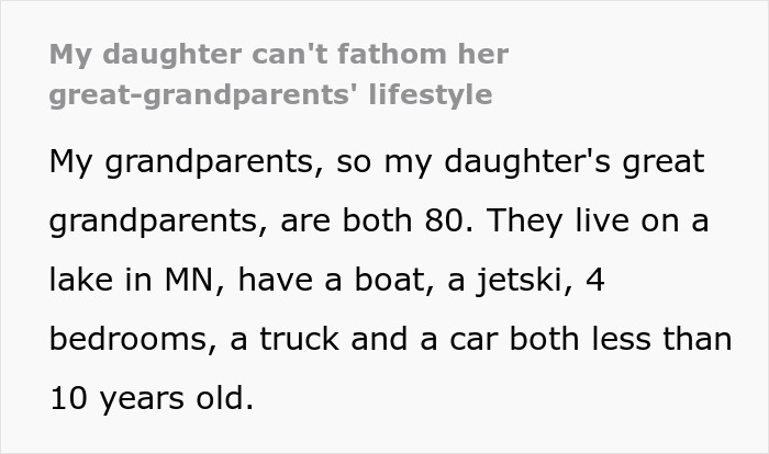 OP’s 6-year-old approached her asking what her great-grandparents did for a living. She responded that great-granddad worked for the state and great-grandma was a secretary. This particular question arose within the context of her great-grands owning a 4-bedroom lakeside house in Minnesota, a boat, a jet-ski, as well as a truck and a car, both under 10 years in use.