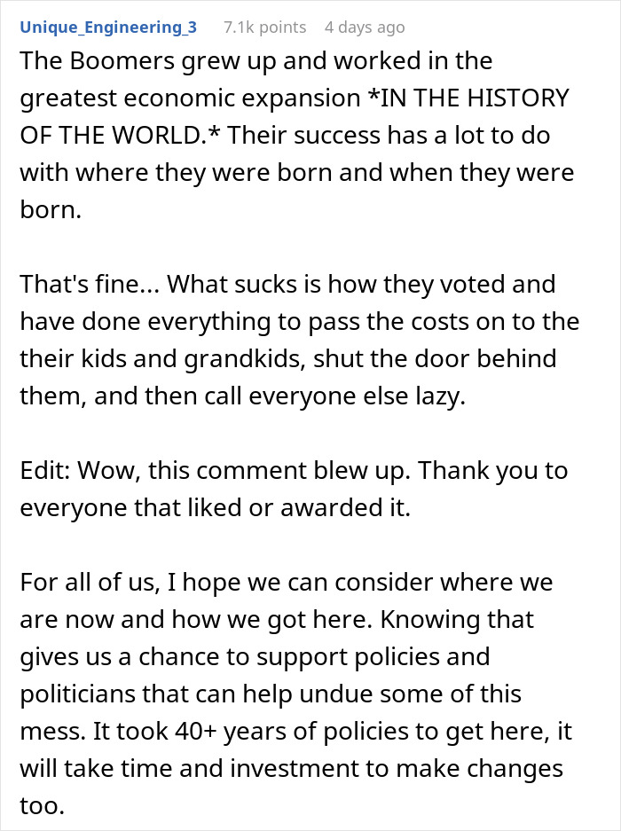 Load More Replies...you hit the nail right on the head! it's not that we hate older people, it's that we don't like older people that are willfully ignorant about how hard life has become with minimum wage not increasing as quickly as inflation or the cost of housing.