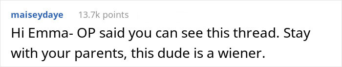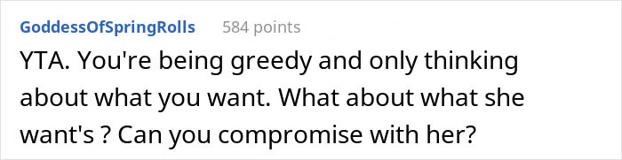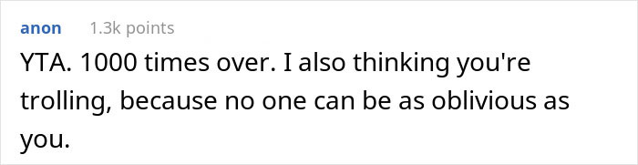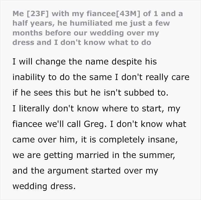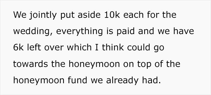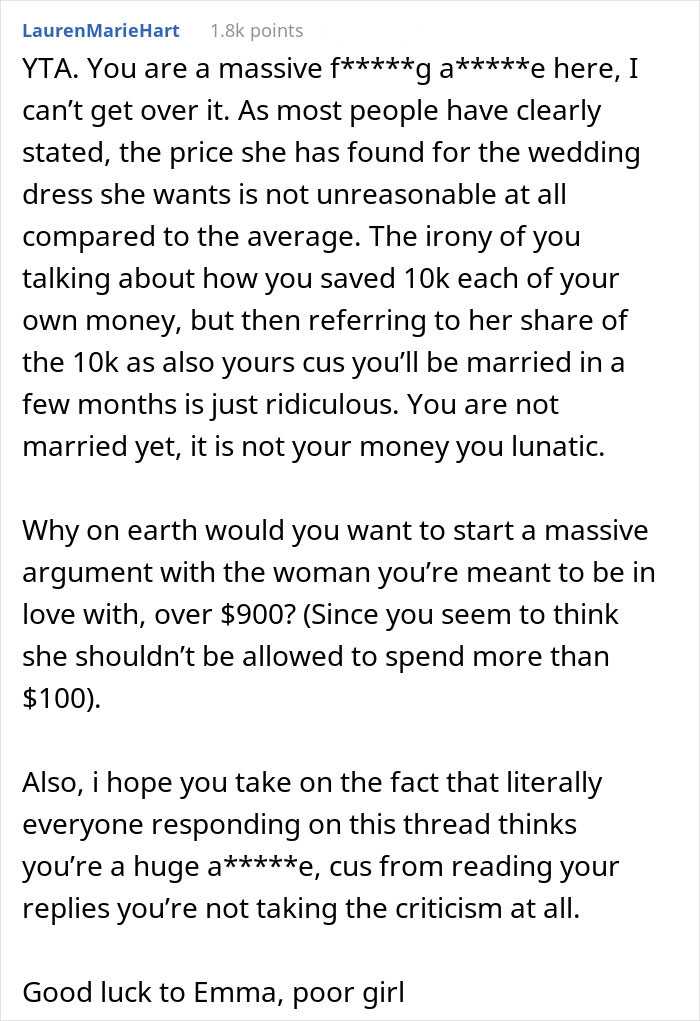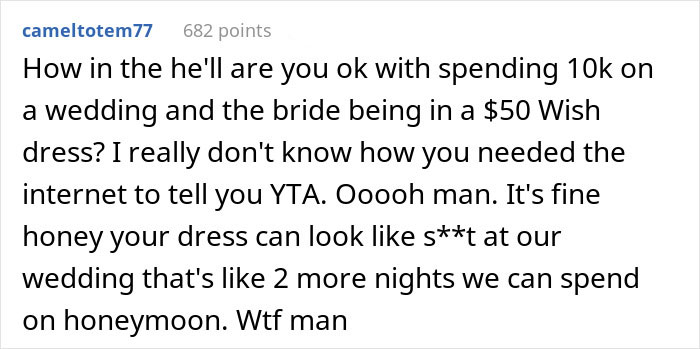 The fact that he believes that he is entitled to make calls about her appearance and her bank account before the vows have even been read is quite telling. Even further, he seems to sincerely believe that he is in the right, as he turned to the internet for validation, only to have it blow up in his face (see below). When presenting one side of a story to the internet, it’s pretty easy to skip details and sugarcoat certain parts. While we can applaud his honesty, it’s a sign of his entitlement that he no doubt thought he would be proclaimed as ultimately in the right. As readers can find below, that did not happen at all.